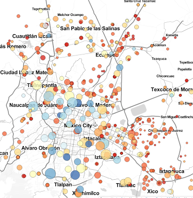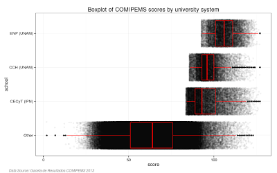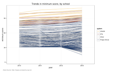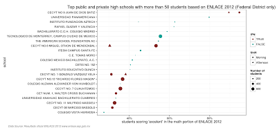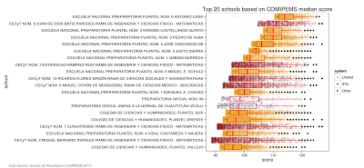 With two exceptions, the top spots are schools run by the UNAM or the IPN. I wonder what the Preparatoria Oficial 99 is doing to attract so many smart students? If you look at the map the rest of the zone it is located in (Coacalco) has quite low scores.