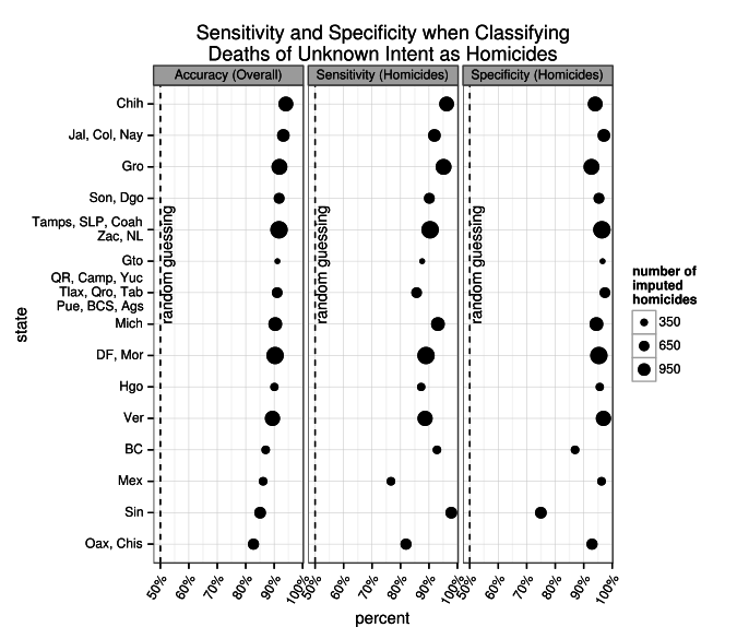 I again classified all deaths of unknown intent into accidents, suicides and homicides based on the age, sex of the victim and injury mechanism by which the death occurred. The method I used is similar to the one I used in my Juarez post (with a penalized regression for Sinaloa and knn for the rest of Mexico). For example, if someone told you to guess the intent of the death of a 70 year old woman who died in Merida by motor vehicle, you’d probably guess it was an accident. If you had to guess the intent of the death of a young male in Acapulco who died by firearm, you’d probably think it was an homicide.