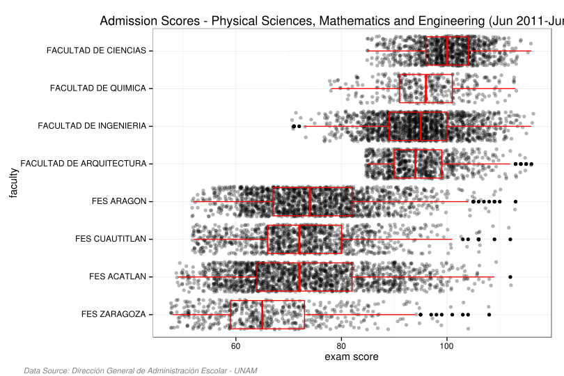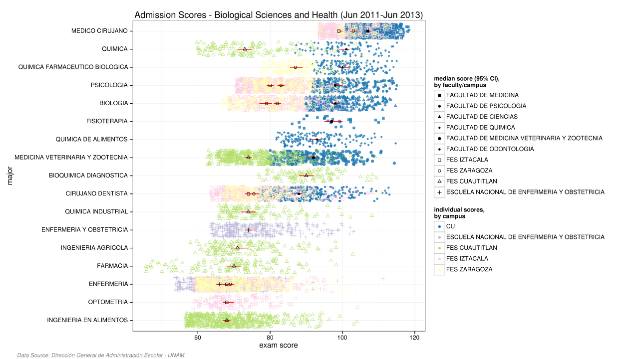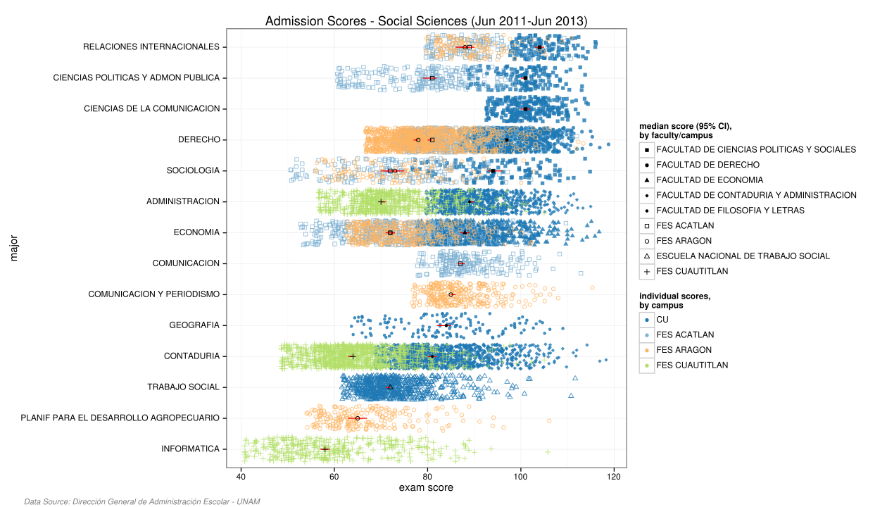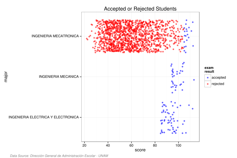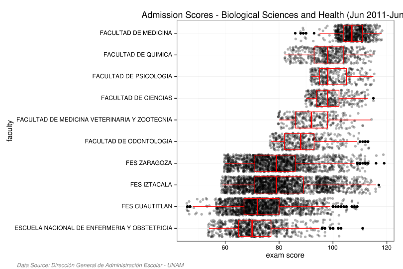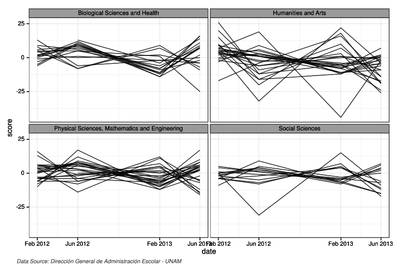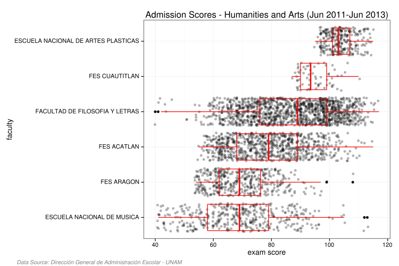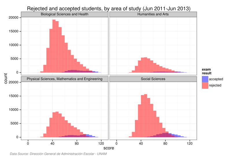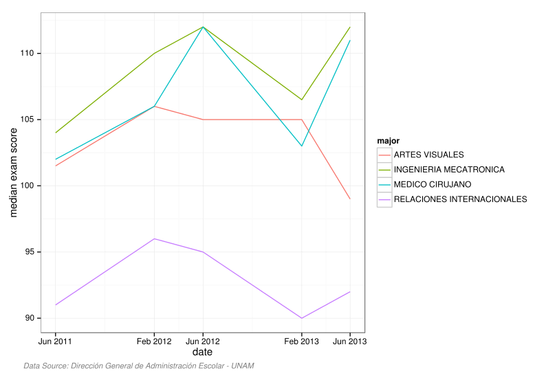 I scrapped all admission results from the UNAM’s website from June 2011 to June 2013. There were some problems with the data at the UNAM’s end since the listings didn’t always match the summary statistics included in the web pages. If you visit the results for Historia del Arte you’ll see that the summary statistics claim that zero students applied to take the test, but the listing includes 3 students (given the test scores of infomatics students I’m not surprised by the mistakes). Anyways, this kind of mismatch was rare and didn’t involve that many students. I took the actual listing to be definitive. In addition the results sometimes include data from students whose result is Cita para aclarar situación escolar, I simply interpreted this as being a missing value.