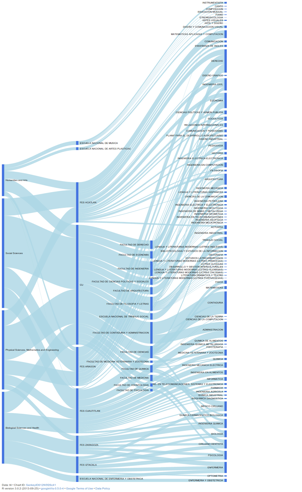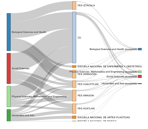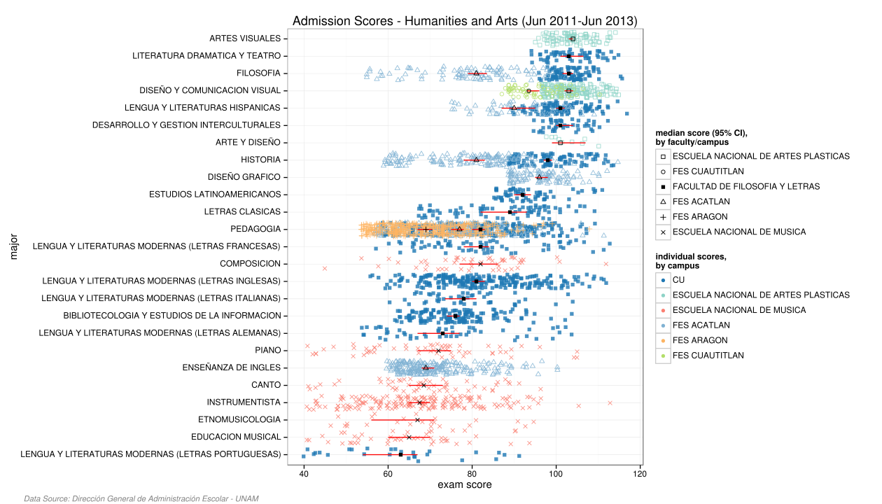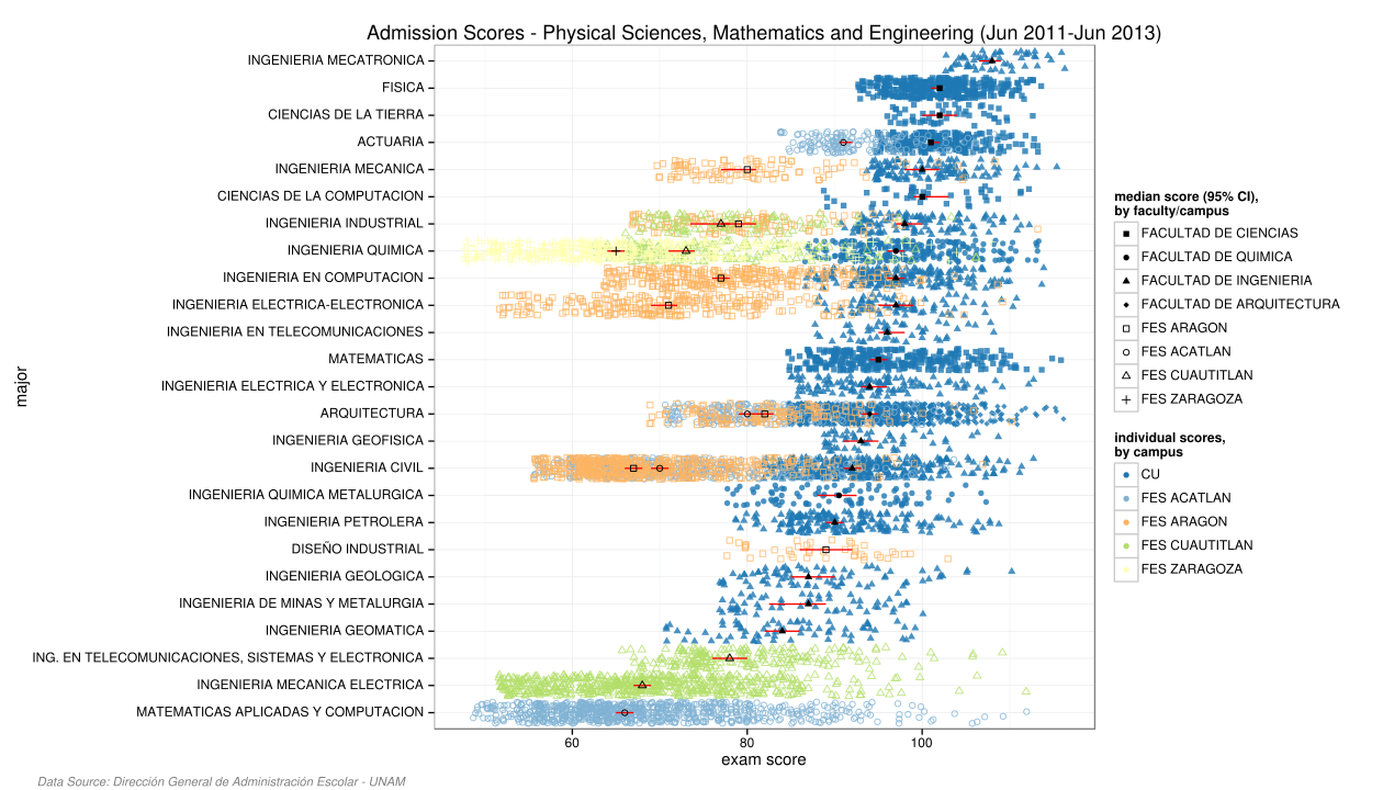 Apart from UNAM’s main (and most prestigious) campus of Ciudad Universitaria (CU), the university has several satellite campuses in the Mexico City metro area as well as many others across Mexico. In this post I will only analyse those located in Mexico City, and only for the scholarized system (sistema escolarizado) where the students have to actually sit in a classroom (the UNAM also offers remote TV/Internet classes and under an open system). The admission exam to the UNAM is quite competitive and only a small percentage of those who apply actually get in.