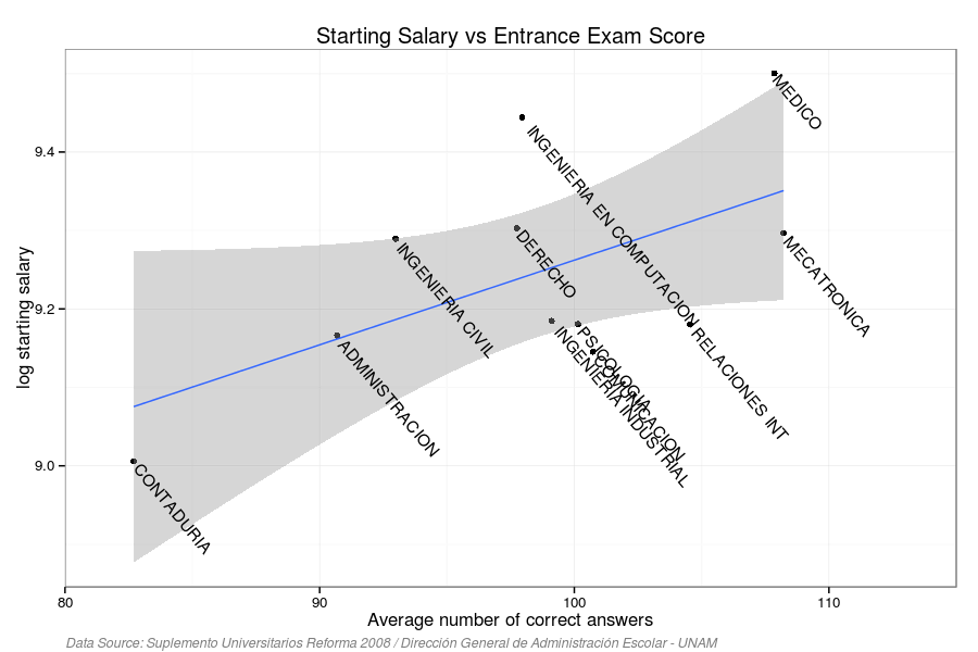 There’s also a positive correlation between average test scores and the starting salaries of university graduates (of any university in Mexico City, not just the UNAM) in a poll conducted by Reforma in Mexico City.