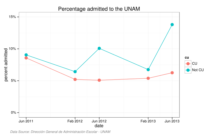 We can see in the above chart how the percentage of students admitted increases at the lower requirement campuses during the June exam, but there is no such increase at the main CU campus. This is probably a consequence of students who had been rejected after the February exam having another go at being admitted at the lower requirement satellite campuses.