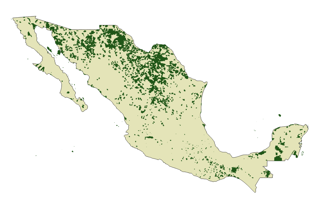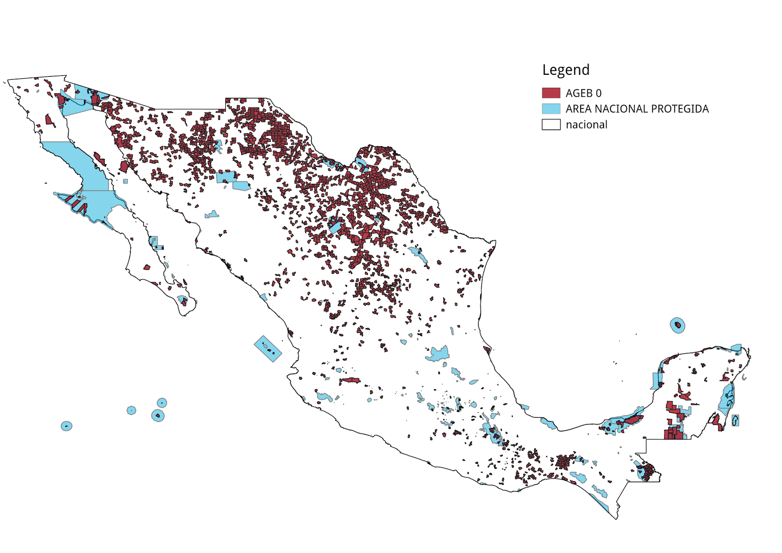 This is an interactive map of all rural AGEBs that contain no localities and thus are empty of permanent residents. If you compare it to the US version, the total area with no people living inside it is much smaller since the data in Mexico is only available at the AGEB level (kind of like Census Tracts), whereas the data in the US is available at the Census Block level which are much smaller. Since there are no polygons available for rural localities, only points, I counted all rural AGEBs that contained a locality as being inhabited.