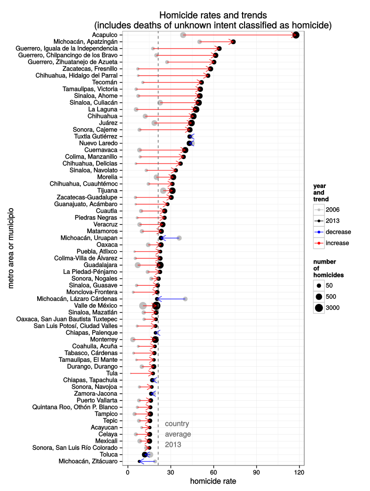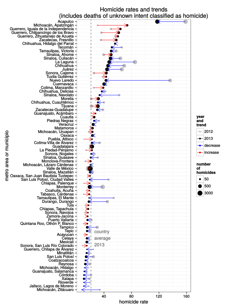 mxmortalitydb package to include 2013 data. This data only package includes all injury intent deaths (accidents, homicides, suicides, and unspcified intent) that were registered in Mexico from 2004 to 2013. You can use the package to calculate changes and trends in homicide rates in the most violent metro areas (or large municipios) or at the national level.