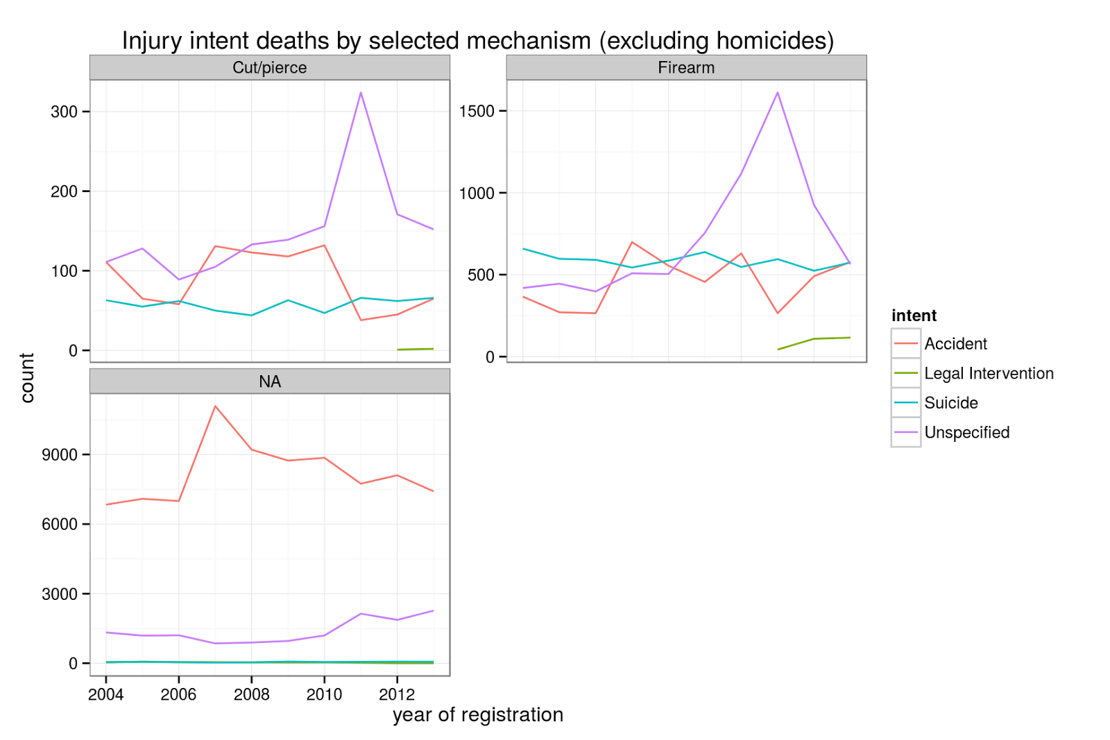 You can also use the package to explore the deaths whose intent was left unspecified (note the large increase in firearm deaths in 2011, the year Mexico had the highest homicide rate in recent history)