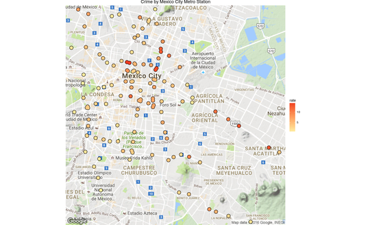 And there you have it, a chart with the crime rates by metro station. There’s still a problem in that the crimes may be systematically biased since the reporting rate is so low in Mexico (93% according to the ENVIPE 2016).