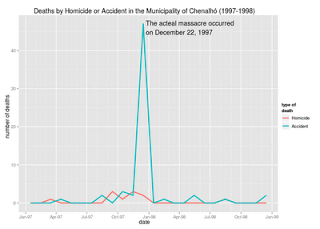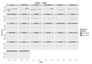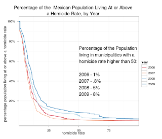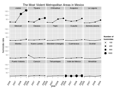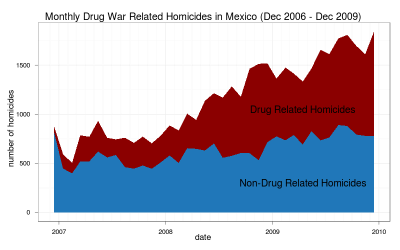 The Mexican government recently released crime data for 2011 at the municipality level. Sadly, it is no disaggregated by month, but beggars can’t be choosers. To analyze the data I made an interactive map with d3 that includes the locations of the municipalities with the highest drug plant eradication and a 2d kernel density estimate of the location of meth labs based on newspaper reports.