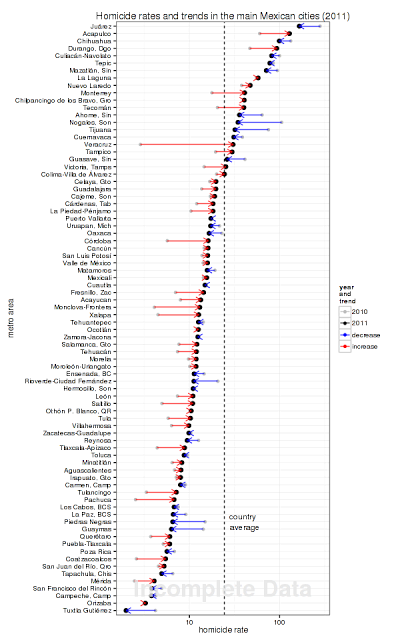 | Rates for Panama and Nicaragua are from 2009, all other countries 2010. Municipalities which are part of a metro area in Mexico are shown with the metro area homicide rate. |