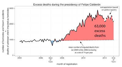 After reading The Better Angels of Our Nature: Why Violence Has Declined, by Steven Pinker, and looking at reviews of the literature on homicide decline in Europe, it seemed to me as if some of the posited reasons for the decline of violence would involve strong cohort effects —each generation successively becoming less and less violent. This immediately reminded me of Mexico, and so I decided to take a quick look at the data: