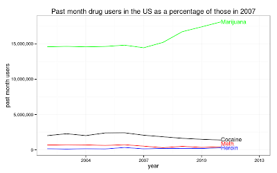 According to data from the National Survey on Drug Use & Health 2001-2011 marijuana and heroin use are up, but cocaine and methampethamine use are down. (Data on methamphetamine consumption was statistically adjusted to account for survey changes)