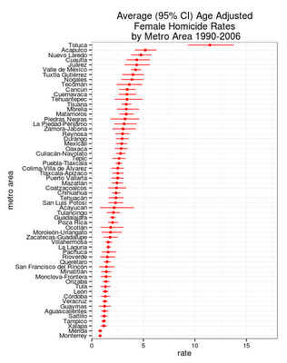 Before the drug war the metro area of Toluca was by far the most violent city in Mexico for females and not Ciudad Juarez as commonly believed, in fact, when cities are ranked by their age-adjusted homicide rates from 1990 to 2006 (right before the drug war started) Juárez was not much more violent than Mexico City (Valle de México in the chart).