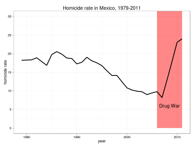 Ever since the end of the Mexican Revolution and the Cristero War violence in Mexico inched down in fits and starts from a high of about 60 homicides per 100,000 people to its lowest level sometime during the middle of the last decade (there’s some uncertainty about the number of homicides in 2007). Then, the drug war happened and the homicide rate shot straight up.